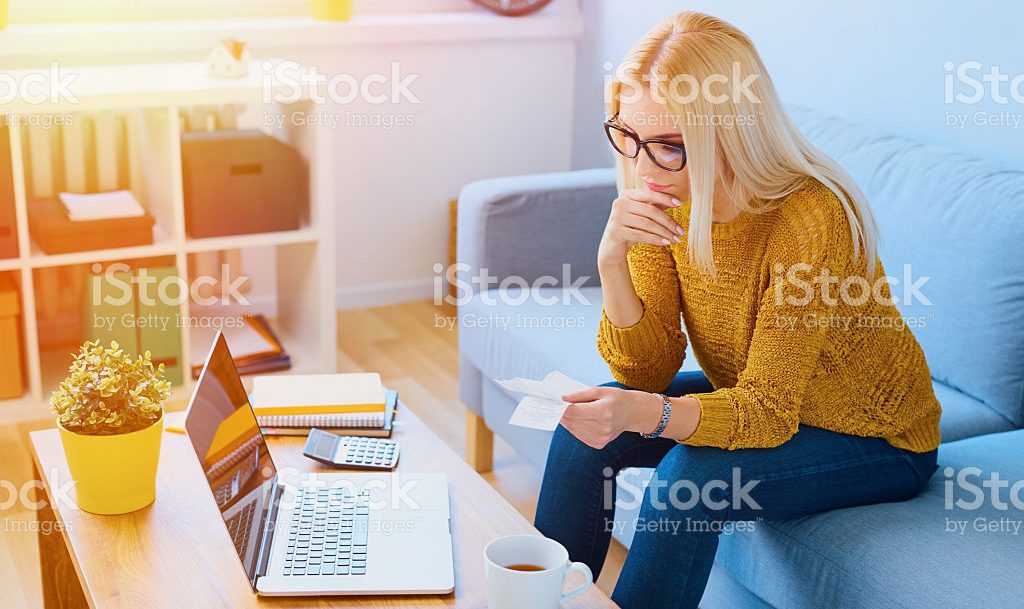 Young Woman Counting Expenses At Home With Bills And Laptop