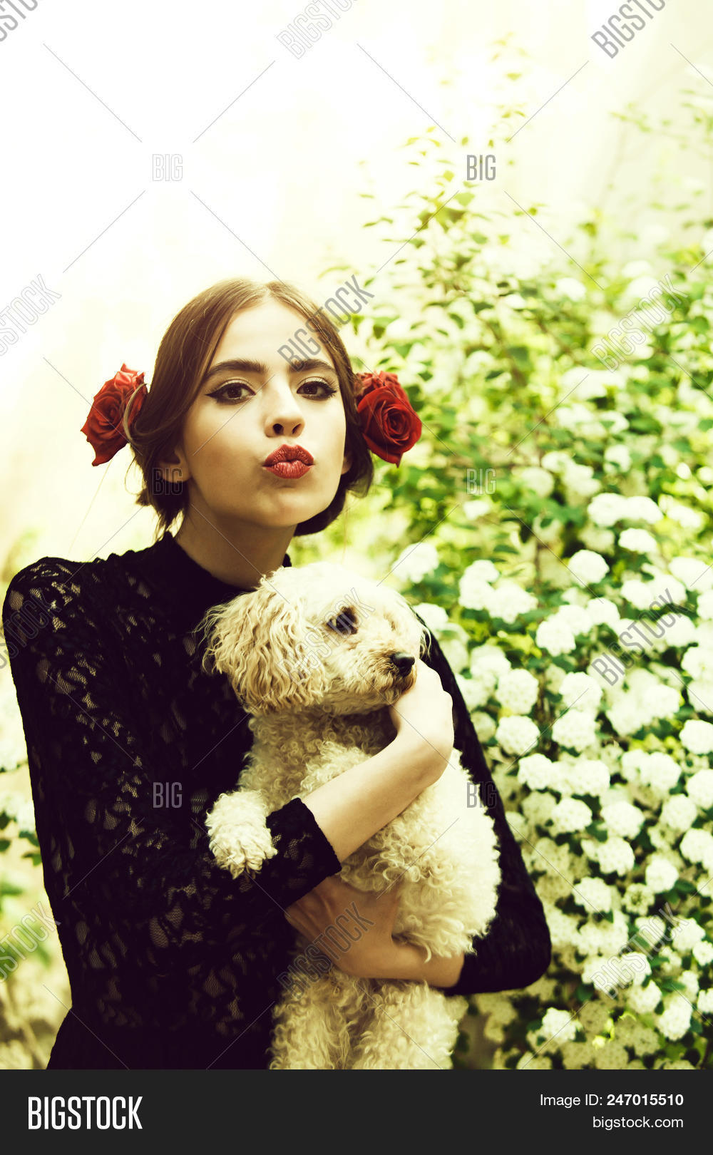 Elegant Girl With A Dog Girl With Fashionable Makeup And Red